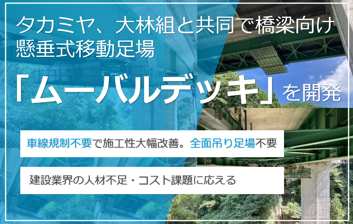 株式会社タカミヤは、TOKYO FMをはじめとする全国36局ネットのラジオ番組「ONE MORNING」内コーナー「NEW TREND ONE」にて、当社の取り組みが紹介されました。本コーナーでは、大林組と共同開発した橋梁向け懸垂式移動足場「ムーバルデッキ」を取り上げていただき、建設現場における安全性向上や施工効率化に向けた取り組みとしてご紹介いただいています。 取り組みについてはこちらをご覧ください ▼タカミヤ、大林組と共同で橋梁向け懸垂式移動足場「ムーバルデッキ」を開発▼