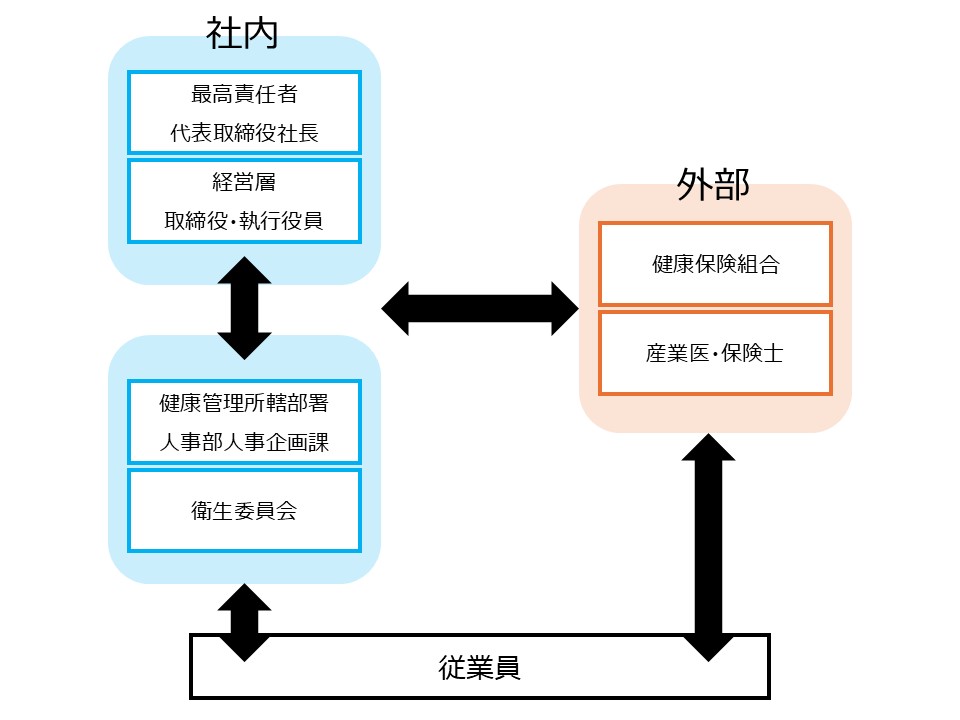 健康経営推進責任者のもと、外部の産業医・産業保健師・カウンセラー、健康保険協会、社内の各委員会、人事部が一体となって様々な施策に取り組むことで、社員の健康維持増進を実現してまいります。