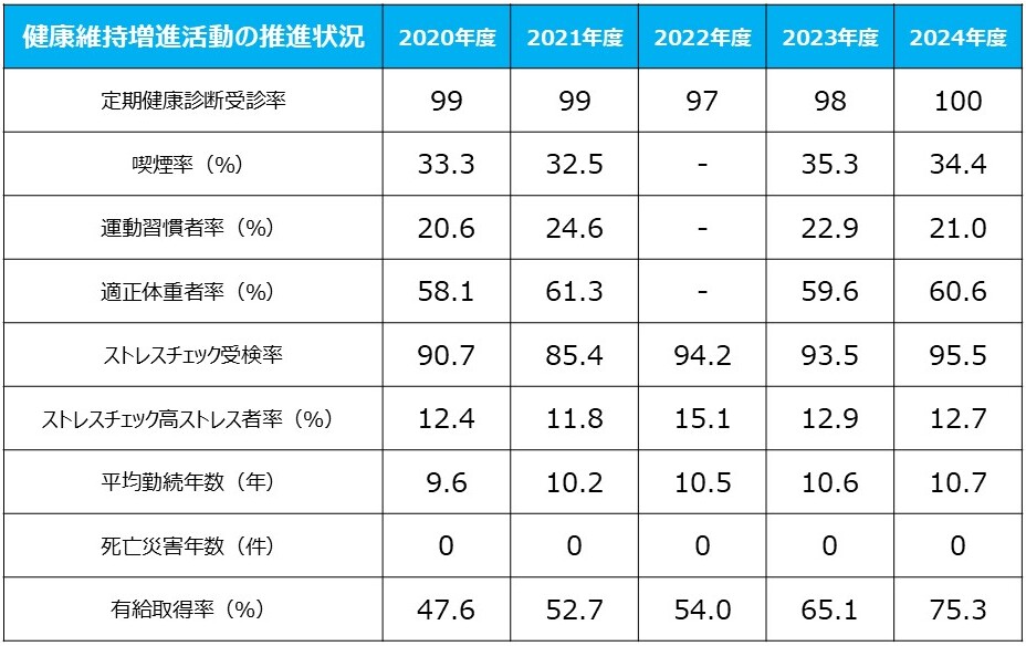 また、各事業所に配置されている産業医、健康保険組合との連携により様々な施策を展開しております。